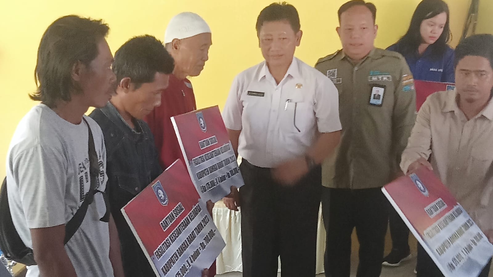 MENTOK — Pemerintah Kabupaten Bangka Barat salurkan bantuan sosial fasilitasi kesejahteraan keluarga tahun 2023, kepada masyarakat di Kantor Desa Belolaut, Kecamatan Mentok, Rabu (8/11/2023).