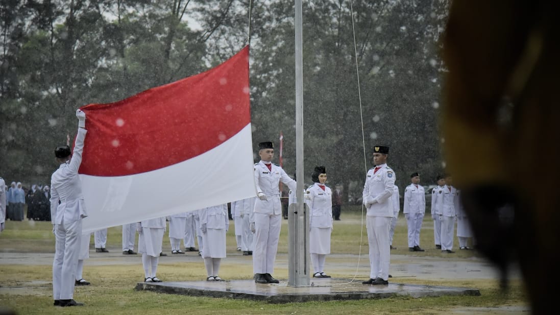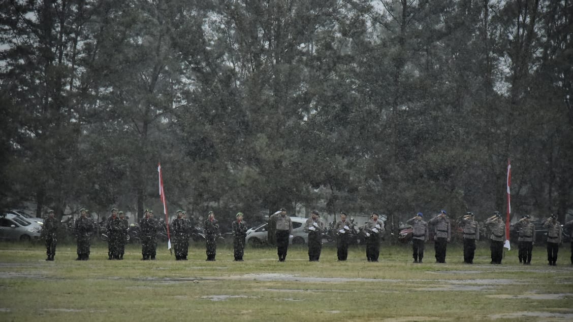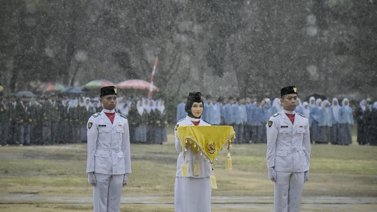 Meski diguyur hujan deras, namun tak menyurutkan semangat para peserta hingga petugas upacara untuk mengikuti prosesi dengan khidmat.