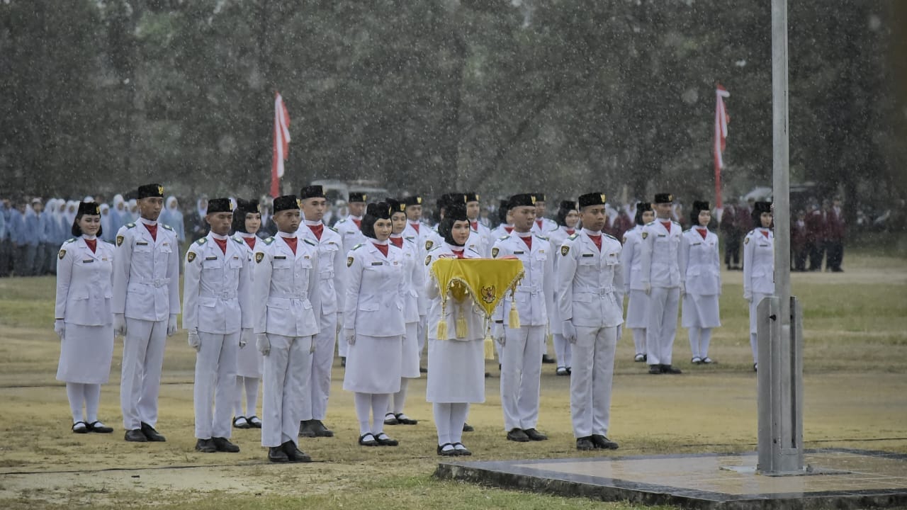 Hujan deras tak menyurutkan semangat Paskibraka Kabupaten Bangka Barat untuk mengibarkan bendera Sang Merah Putih, dalam upacara Peringatan Hari Lahir Pancasila tahun 2024. Foto/Fierly