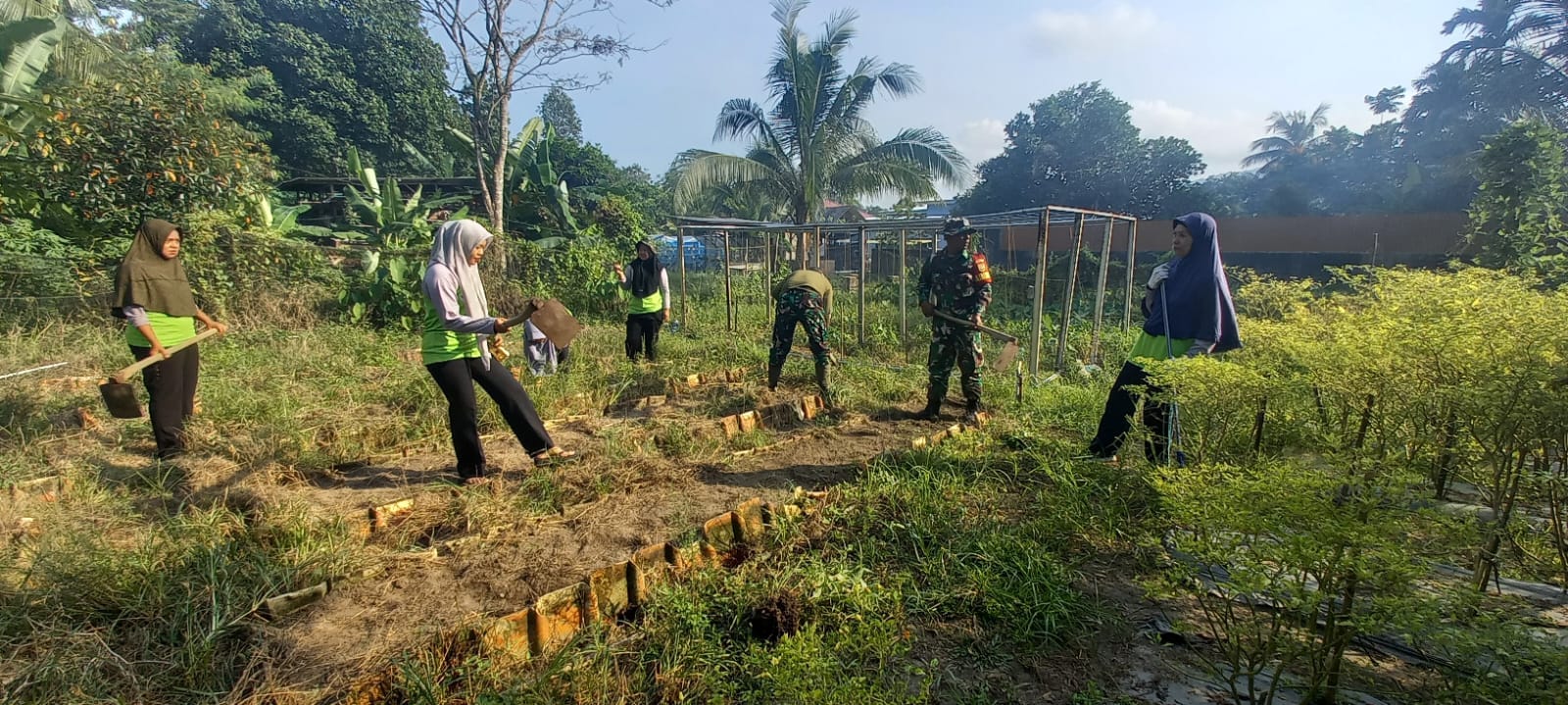 BANGKA BARAT — Serda Purnomo dan Pratu Ongky Babinsa Koramil 431-02/Muntok gelar gotong royong bersama Kelompok Wanita Tani (KWT) IPAL Kampung Senang Hati bertempat di lahan Pertanian, Senang Hati, Sungai Daeng, Sabtu (20/7/2024).