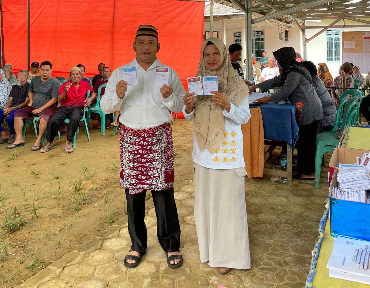 Tampak mengenakan kemeja warna putih dan dilengkapi kain serta kopiah berwarna cokelat, Mansah didampingi oleh istrinya mencoblos di TPS, pada Rabu (27/11/2024) sekitar pukul 07.30 Wib.