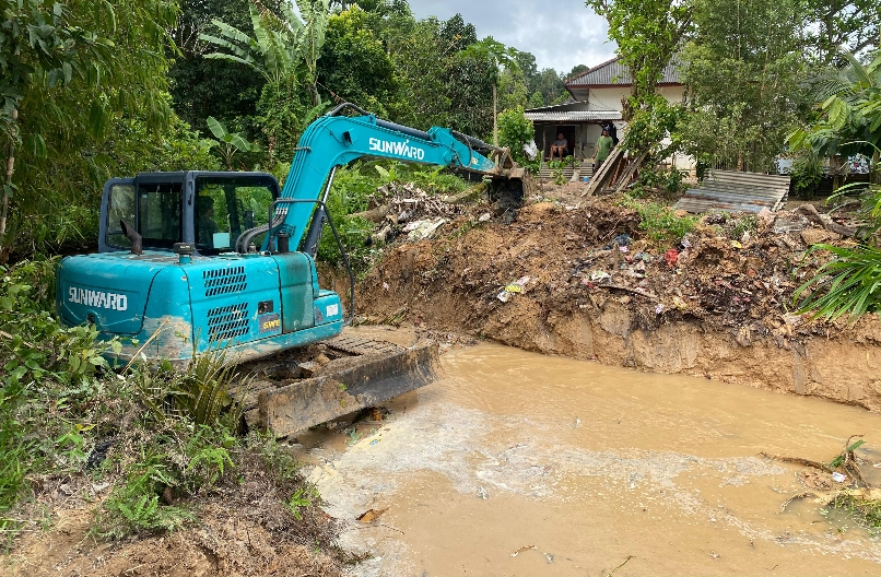 Normalisasi aliran dua sungai ini turut dibantu dengan menggunakan satu unit alat berat ekskavator.