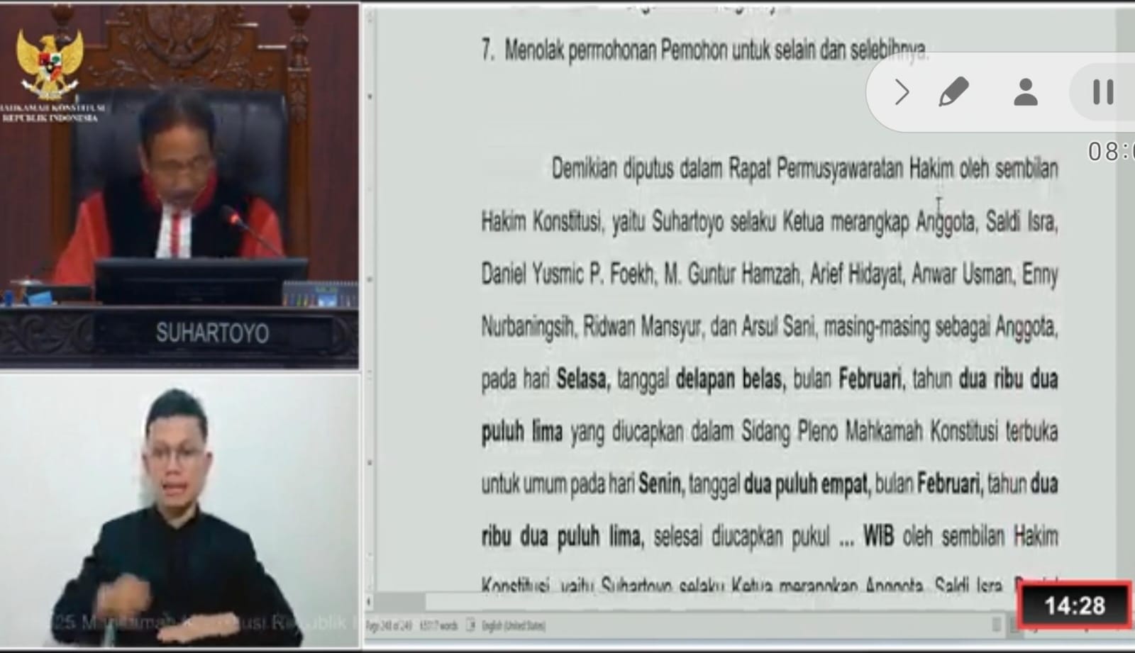 JAKARTA – Mahkamah Konstitusi (MK) telah menggelar rapat putusan terkait selisih hasil pemilihan Bupati dan Wakil Bupati, Kabupaten Bangka Barat (Babar), Provinsi Kepulauan Bangka Belitung (Babel) tahun 2024, pada sidang Senin (24/2/2025) di Gedung MK.