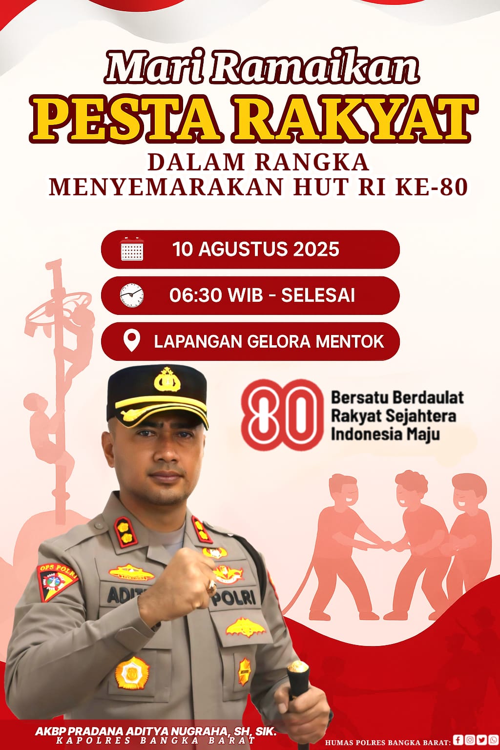 BANGKA BARAT – Dalam rangka memperingati Hari Ulang Tahun Republik Indonesia ke-80, Polres Bangka Barat akan menggelar Pesta Rakyat yang terbuka untuk seluruh lapisan masyarakat.