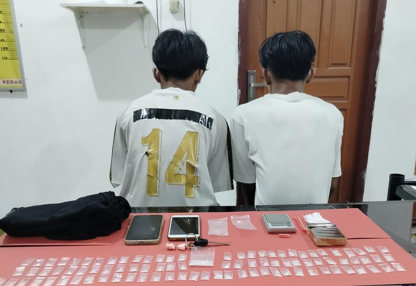 “Total sabu puluhan gram itu tersimpan dalam 1 paket besar dan 91 paket kecil ya. Kemudian kami juga mengamankan 1 unit HP android Redmi 10A berwarna silver hitam. Satu unit HP android Vivo Y66 warna coklat putih, 2 buah plastik klip bening kosong,” ungkap Nikko.