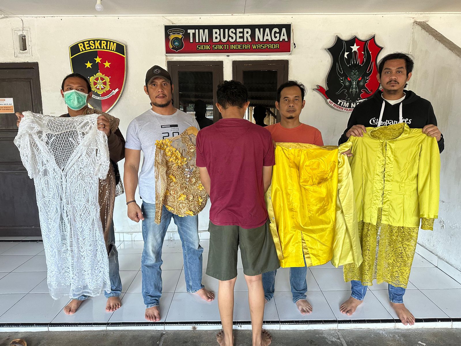 Dari tangan pelaku, polisi menyita beberapa barang bukti berupa satu stel pakaian pengantin pria dan wanita warna kuning, satu stel gaun warna emas, satu stel gaun warna putiht, satu stel gaun warna cokelat.